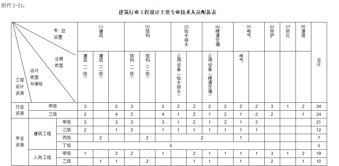 4.建筑工程丁級資質(zhì)的專業(yè)設(shè)置中,技術(shù)人員總數(shù)不少于5人,其中二級以上注冊建筑師或注冊結(jié)構(gòu)工程師不少于1人;具有建筑工程類專業(yè)學(xué)歷、2年以上設(shè)計經(jīng)歷的專業(yè)技術(shù)人員不少于2人;具有3年以上設(shè)計經(jīng)歷,參與過至少2項工程設(shè)計的專業(yè)技術(shù)人員不少于2人。
